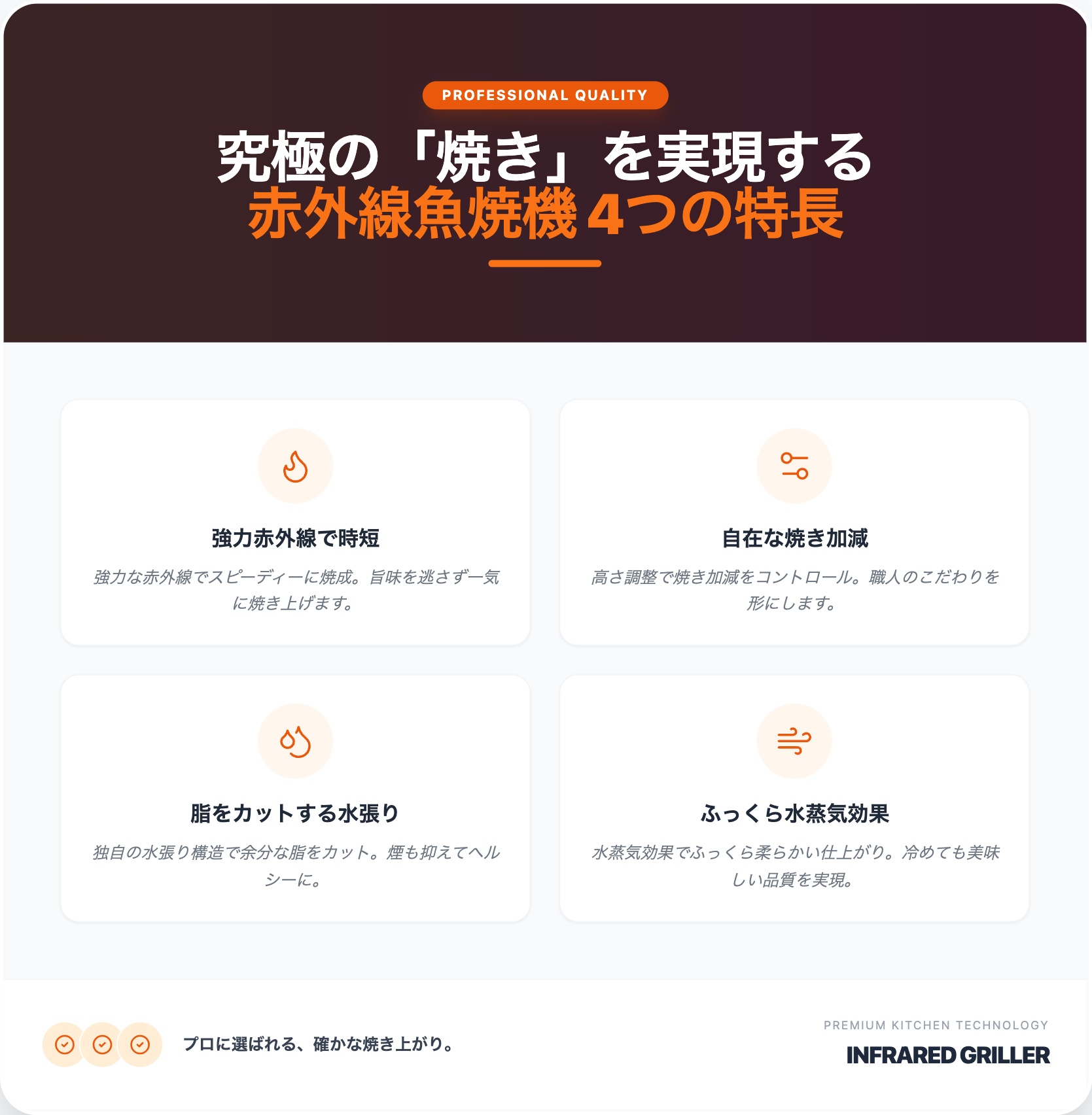 八木厨房が現場目線で設計した赤外線焼き物器は、魚の旨みを最大限に引き出すための一台です。