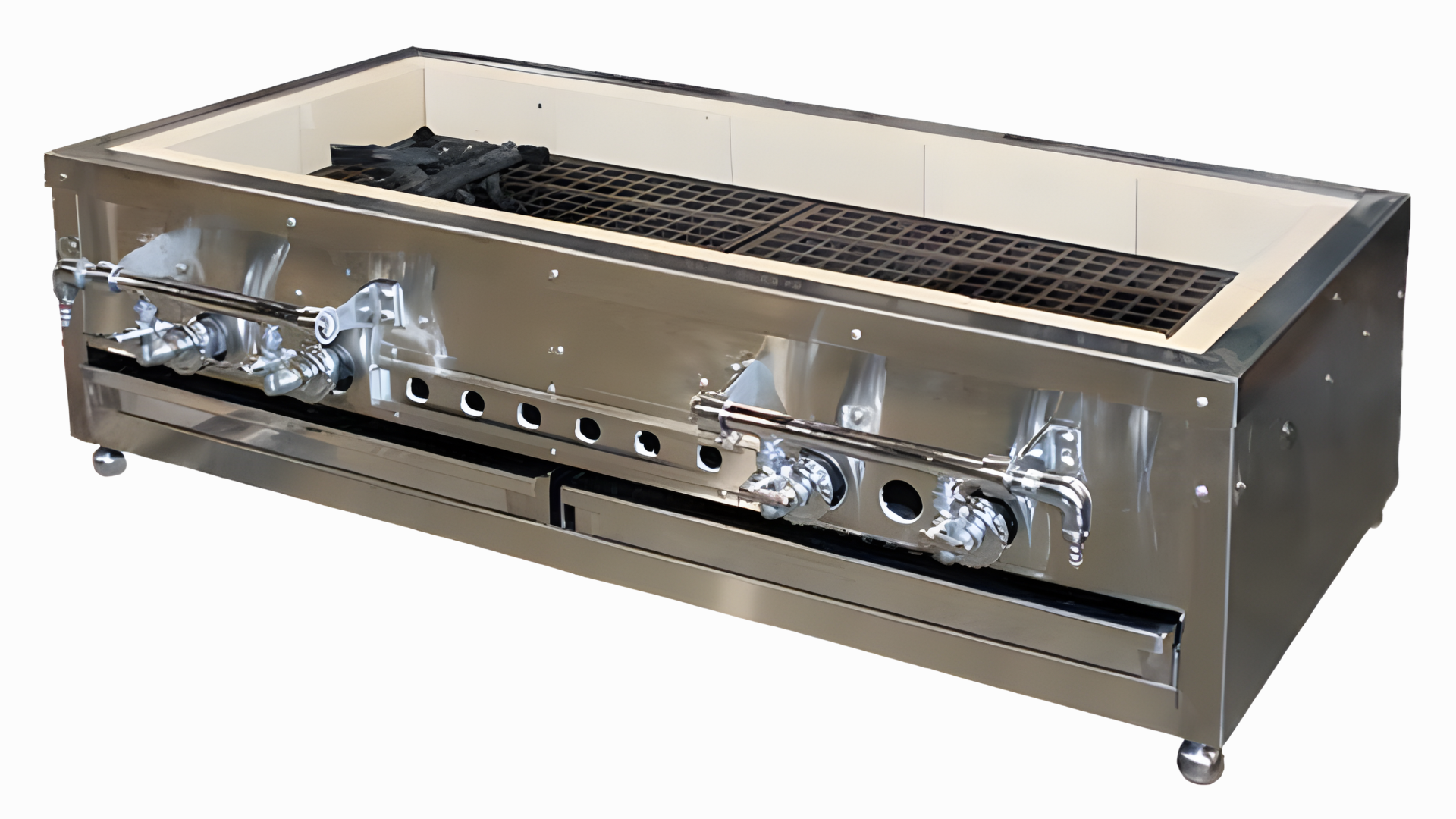 手間と時間のかかる炭の火起こしが、強火力バーナーで素早く着火させることができるので、煩わしい準備作業から解放されます。また、炭火の遠赤外線効果で、素材が持つ本来の旨味を封じ込めた美味しい焼き上がりです。火床は耐火レンガで周囲を囲み、熱を逃がさず熱効率が良く堅牢な構造です。下部の受け皿に、タレや炭カスが溜まりますので、衛生的でお手入れも簡単です。