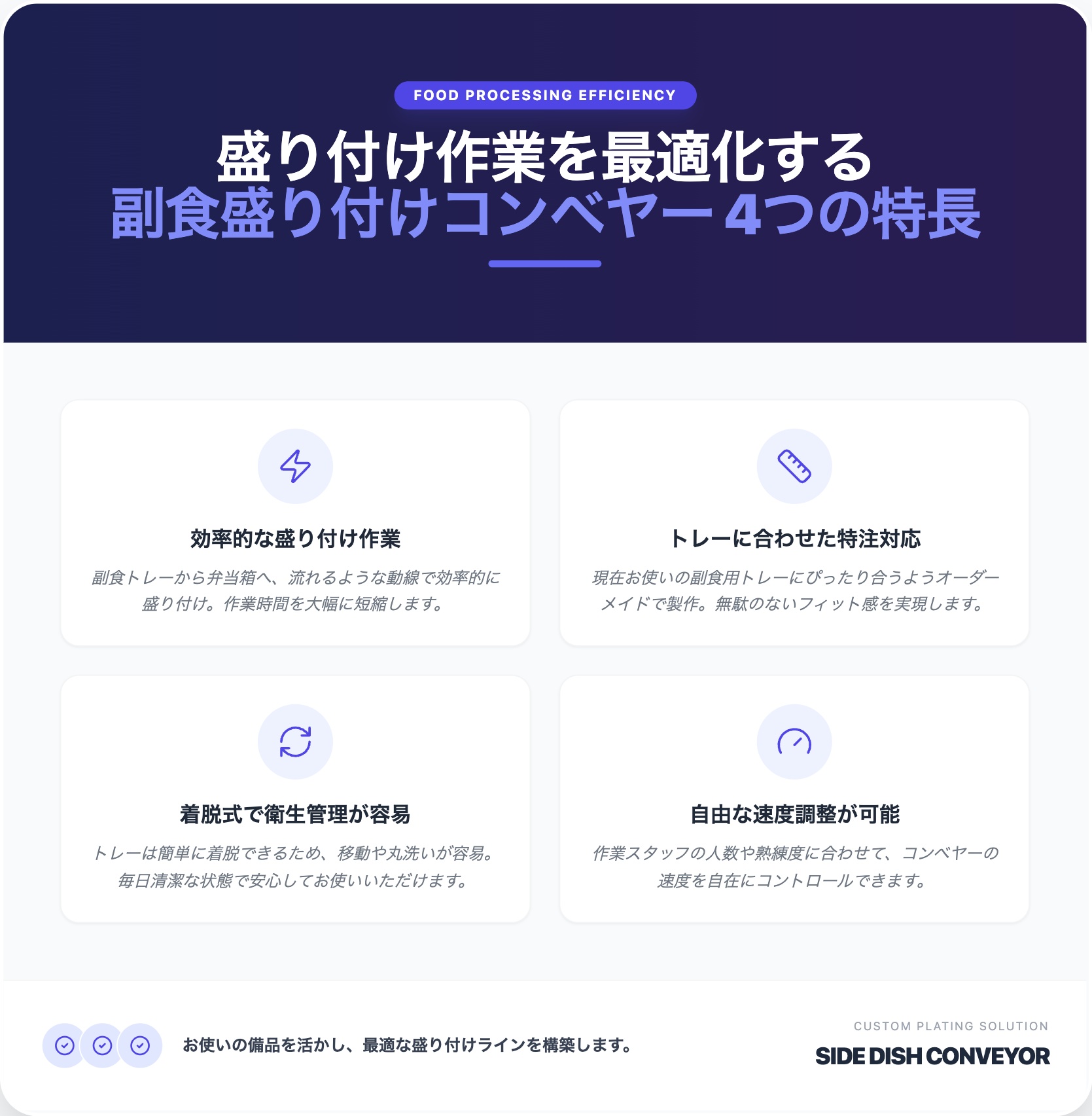 盛り付け作業を、正確に・効率よく。 八木厨房が大量調理・弁当製造の現場に向けて設計した、副食専用の盛り付けコンベアーです。 コンベアー上に配置された副食用トレーから、流れてくるお弁当箱へ順に盛り付けを行うことで、作業動線をシンプルにし、スピードと均一性を高めます。 トレーは、現在ご使用中のサイズ・形状に合わせたオーダーメイド製作が可能。 また、トレーは取り外して移動できるため、仕込み・洗浄・段取り替えもスムーズです。 コンベアーの搬送速度は調整可能。 作業人数や献立内容に応じて、無理のないペースで運用できます。 病院・スーパー・給食センター・コンビニなど、 安定した品質と処理量が求められる現場で多数導入されています。 現場のレイアウト・製造量に合わせたライン設計・特注対応も承ります。 八木厨房が、盛り付け工程の“ムダ”を減らします。